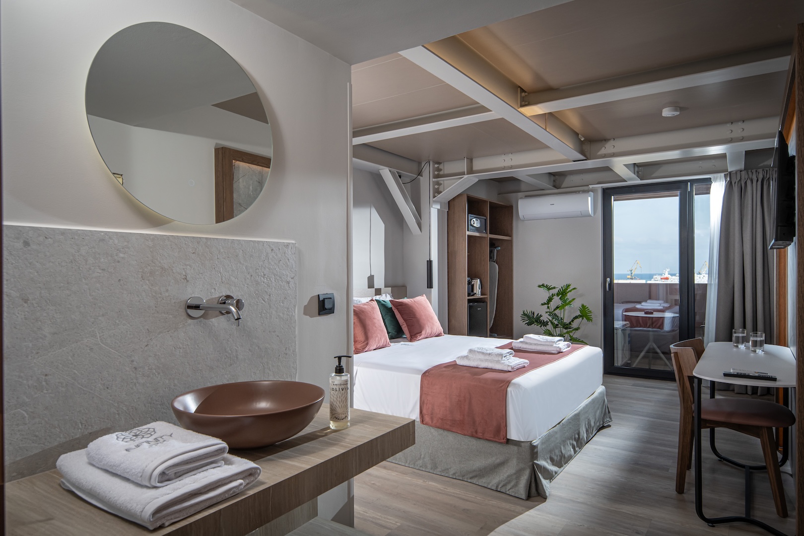 Junior Suite is a spacious room (35m2) which offers an amazing view of the city’s Harbor and it is suitable for two or three persons. The room has a king-size bed, a small kitchen, and a large balcony. Also, in the room, you can find tea/coffee and ironing facilities. Junior Suite is made to offer you a unique experience in Crete’s biggest city.